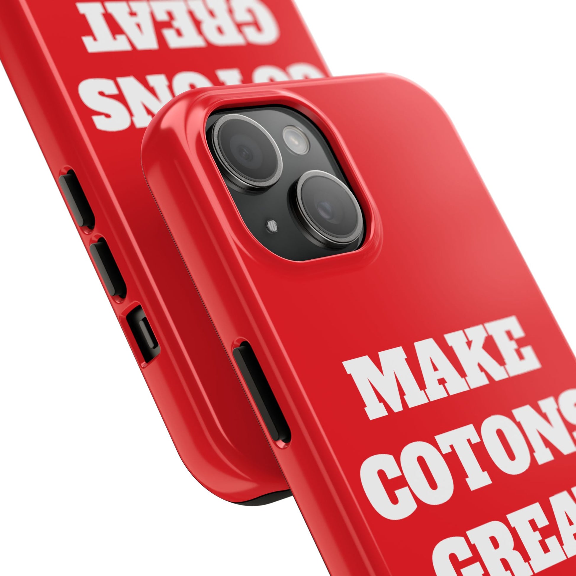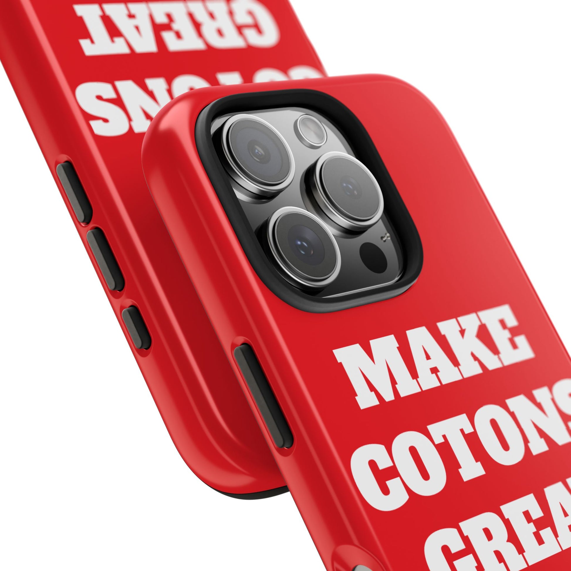 Meet the “Make Cotons Great Again” Tough Phone Case, a bold and protective phone case designed for people who like strong visuals, playful statements, and real everyday protection. Featuring a cheeky, vintage-inspired slogan on a vivid red background, it adds personality without compromising function.